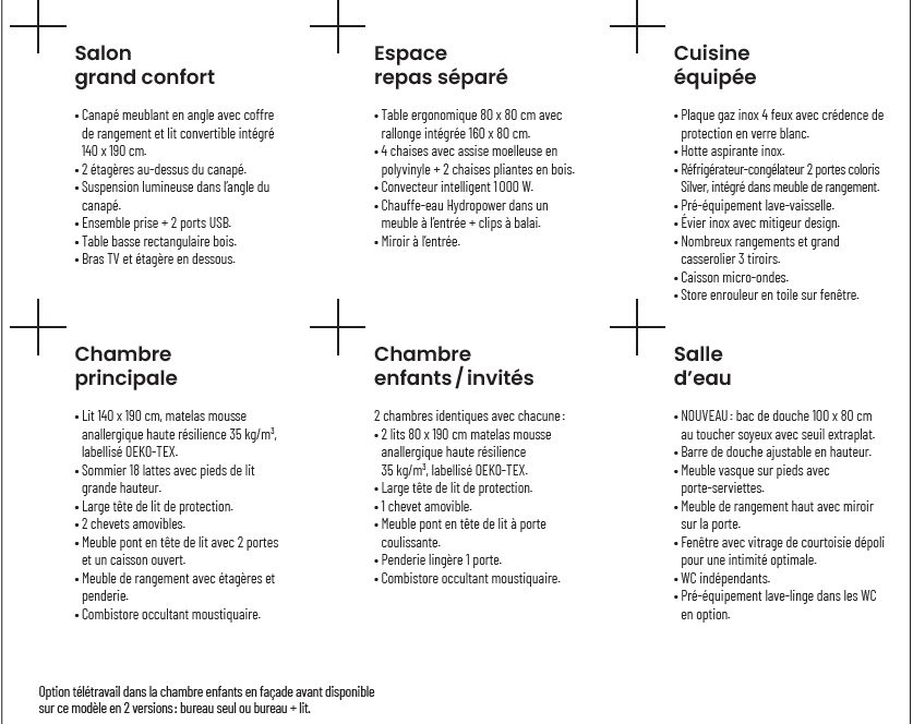 2. Isolation thermique 6 faces type « habitat », 100 % laine de verre. Classique : plancher 50 mm, murs 45 mm et toiture 100 mm. Premium : plancher 100 mm, murs 45 mm et toiture 200 mm